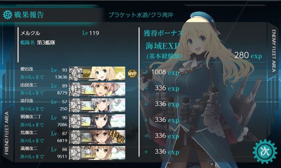 2019ブインE-1乙 2019.01.06 いえーい。明日から仕事だー。 休みが長すぎたので、精神が耐えれるかな(・ω・) いっそ金曜日を休んでしまえば楽になれるんだけど、そうすると19日が仕事になるので良し悪しか。 -艦これ- とりあえずE-1(乙)クリア。 うちの鎮守府は歪んでいるので、村雨がいないというアクシデントもありましたが・・・ まぁ難易度落としてるので、なんとか突破。 問題はE-2はクリア報酬的に(甲)にしたいんだよなぁ。